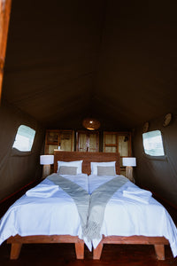 Each tent is thoughtfully designed to balance rustic aesthetics with essential comforts. Imagine waking up to the sights and sounds of the savannah, right from the cozy confines of your tent. Each room has its own private bathroom and a porch overlooking the savannah. The bedroom has a spacious and comfortable double bed.